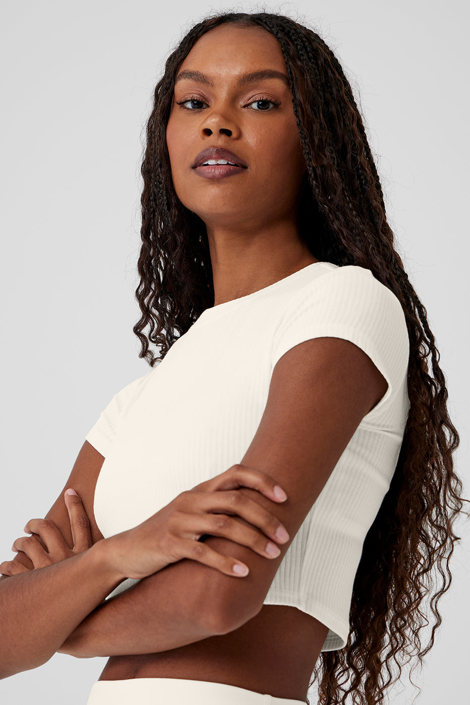 Cut from a soft, stretchy, ribbed fabric blend, this trusty tee is a closet staple you*ll want to buy in multiples. It has a classic crewneck, a slim fit, and not-too-short, not-too-long cap sleeves. Finished with a waist-length crop to pair perfectly with all your favorite high-waisted bottoms.