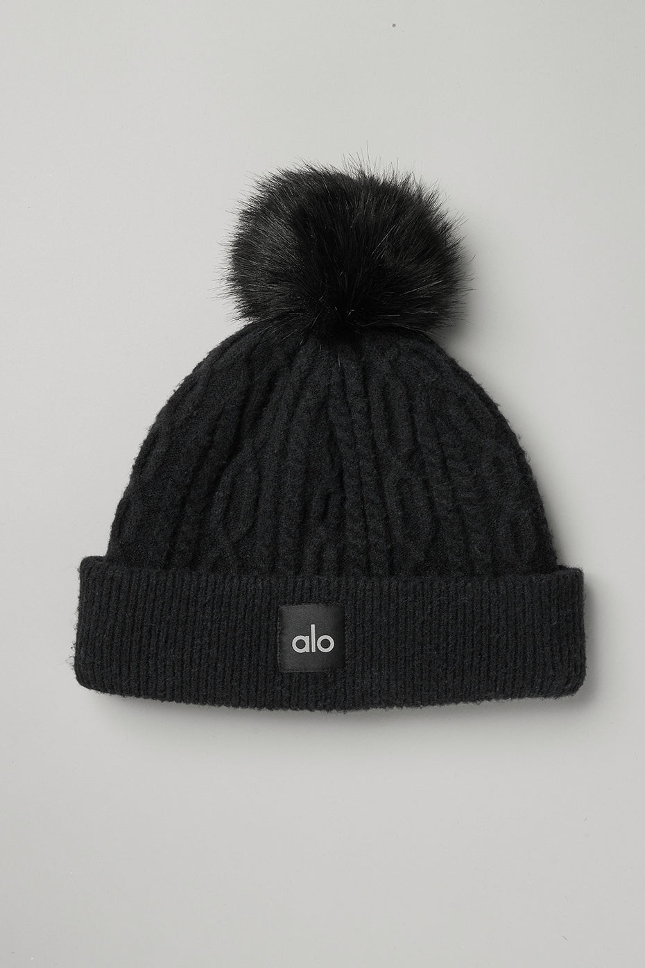 - Cable knit woven fabric with ribbed cuff and faux fur pom