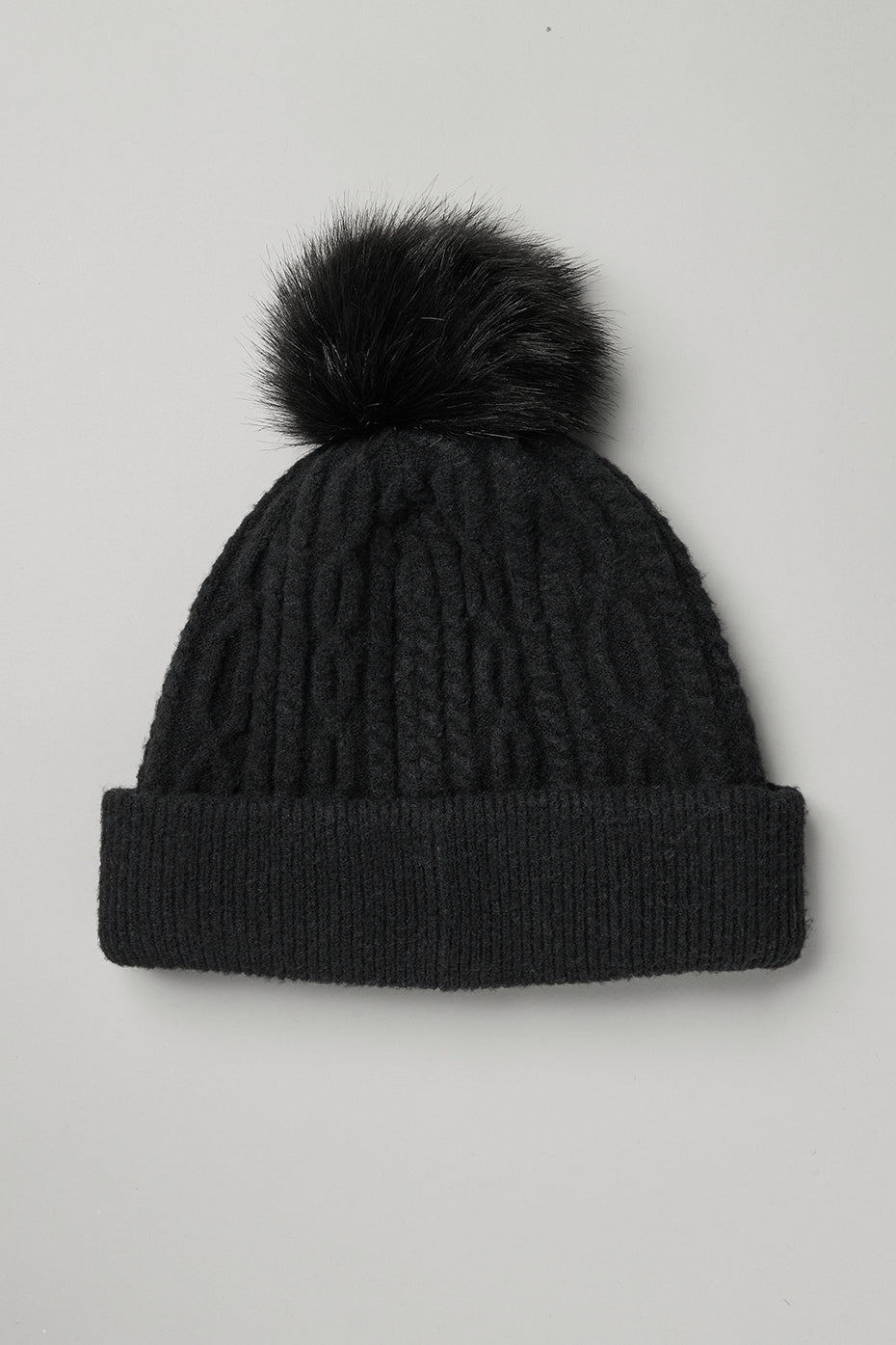 Made from soft and warming cable knit fabric and topped with a fun faux fur pom, the Cable Knit Beanie is a go-to for topping off cold weather looks. Thick, ribbed cuff holds in heat and keeps it secure.